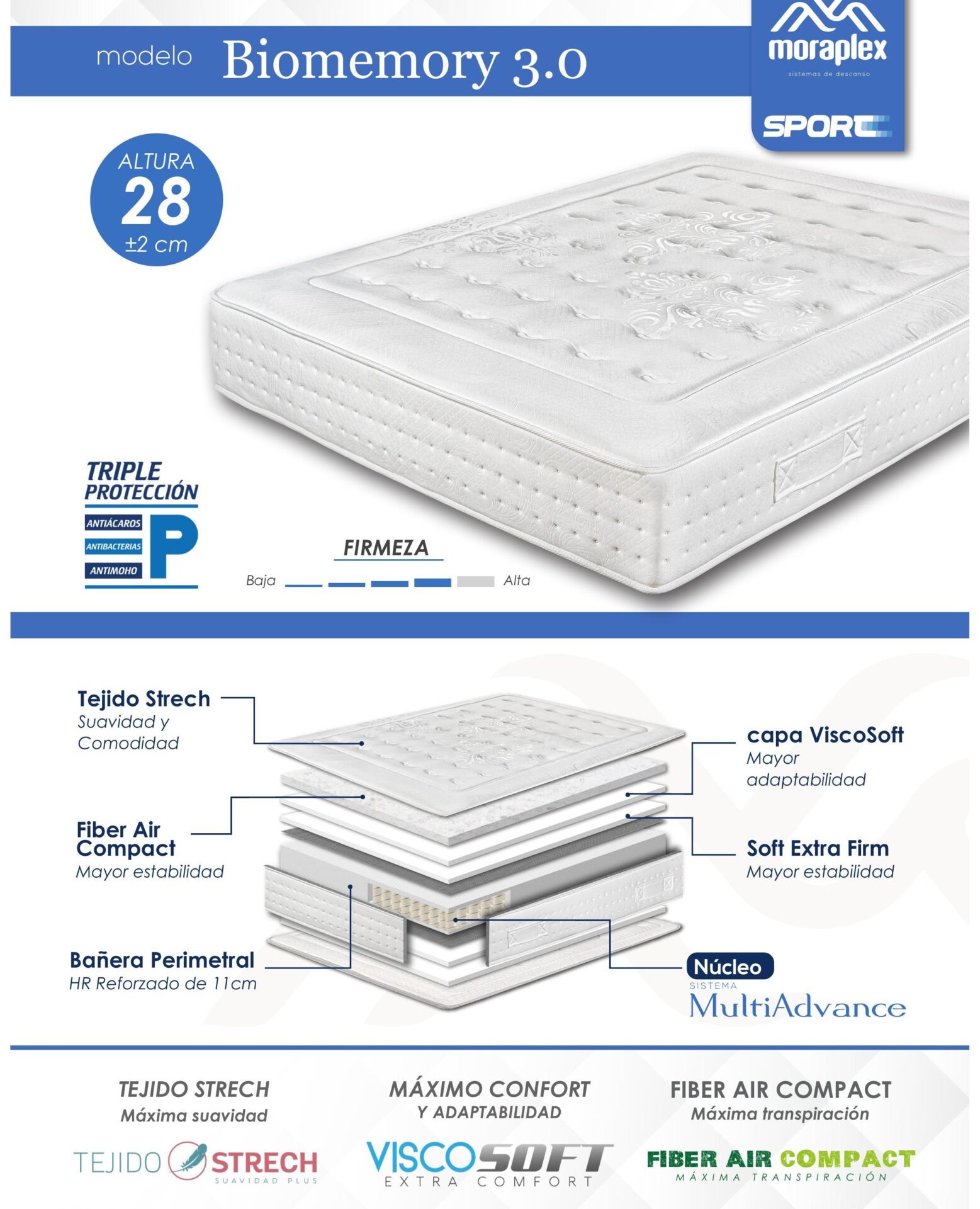 El Biomemory 3.0 combina tecnología viscoelástica avanzada con un núcleo ergonómico de alta densidad que proporciona una adaptación perfecta al cuerpo y un soporte firme y duradero.