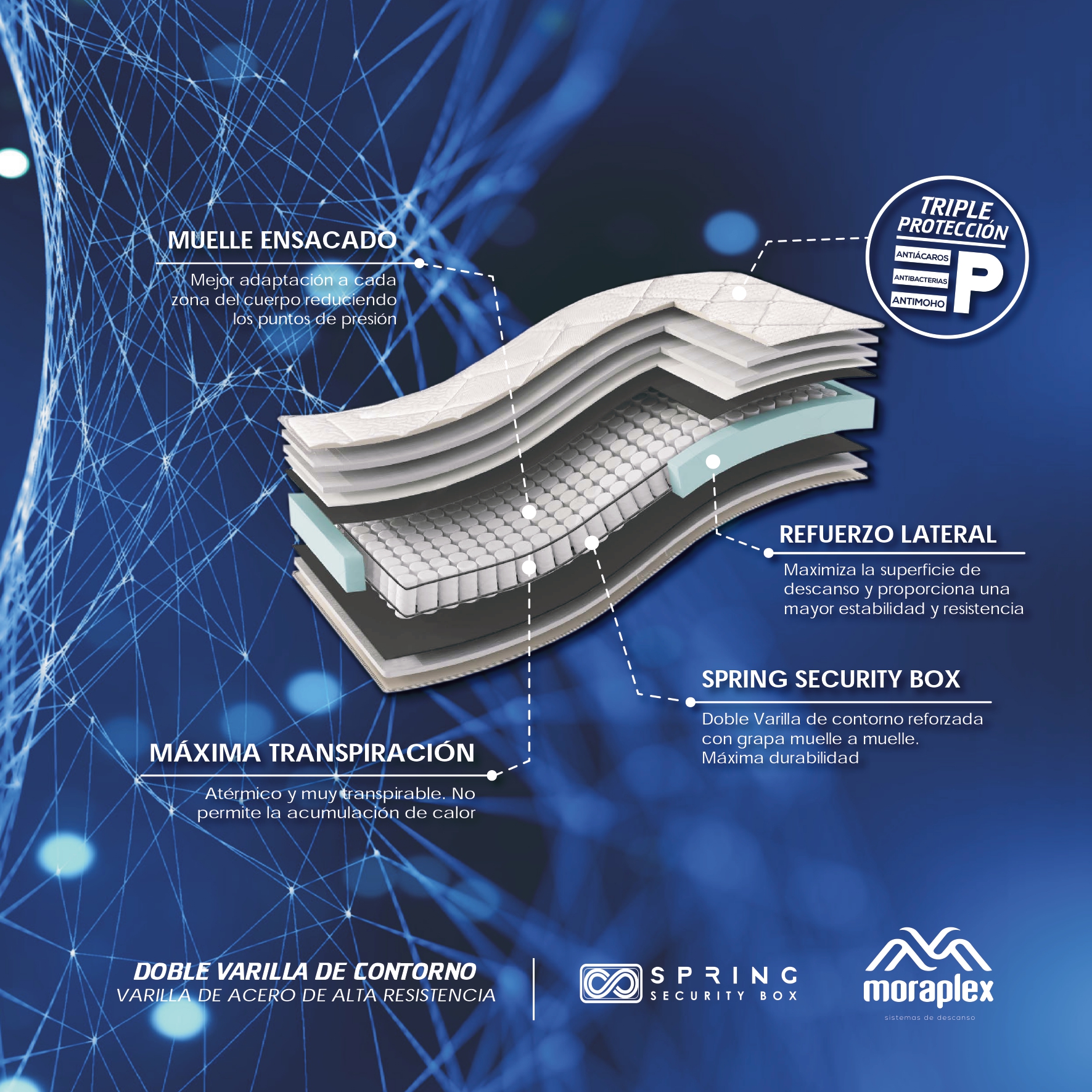 Material técnico que mejora la estabilidad estructural del colchón y favorece la ventilación interna, evitando acumulaciones de calor.
