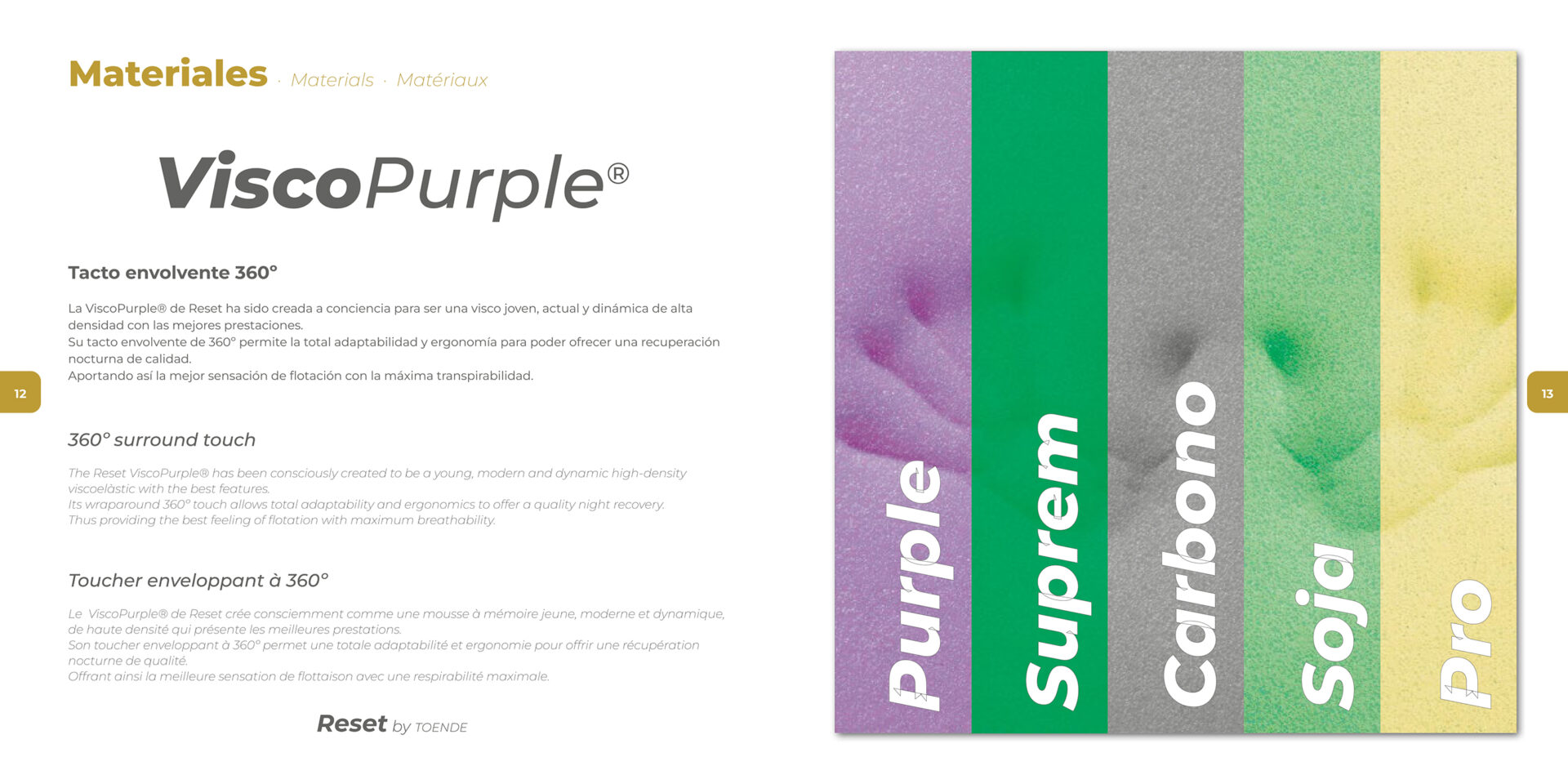 2. ViscoPurple (40kg/m³): Viscoelástica de alta densidad que proporciona un primer contacto de ingravidez, liberando los puntos de presión superficiales.