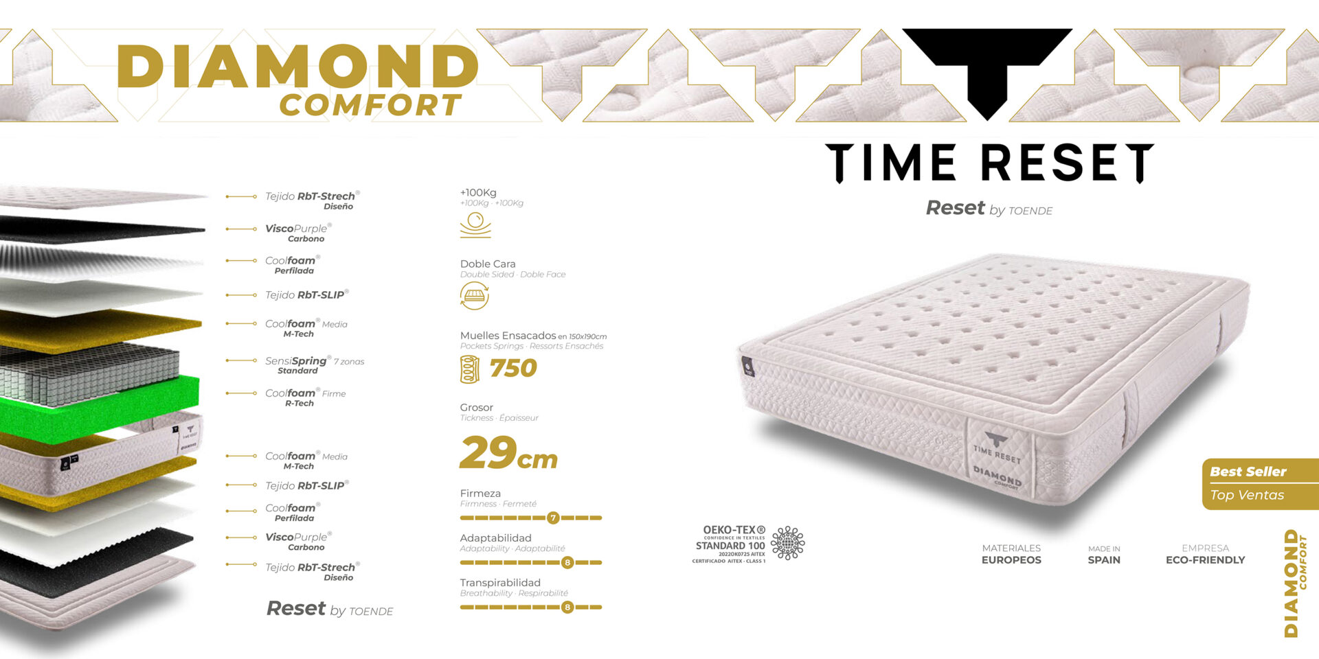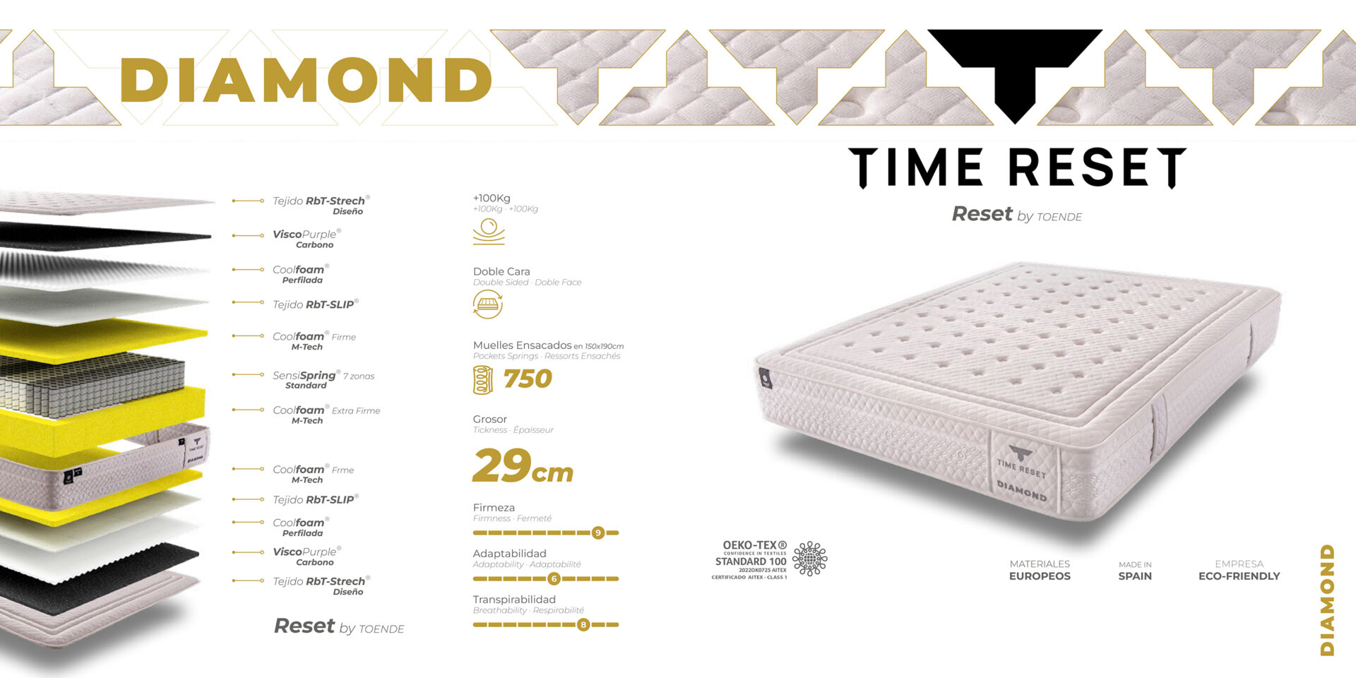 Bajo el lema “El valor de la comodidad”, el modelo DIAMOND de Reset by TOENDE ha sido creado para los durmientes que buscan la sensación de dormir sobre una nube. Este colchón de 28 cm de altura renuncia a la dureza extrema para centrarse en una acogida suave, profunda y extremadamente ergonómica, eliminando cualquier punto de presión en el cuerpo.