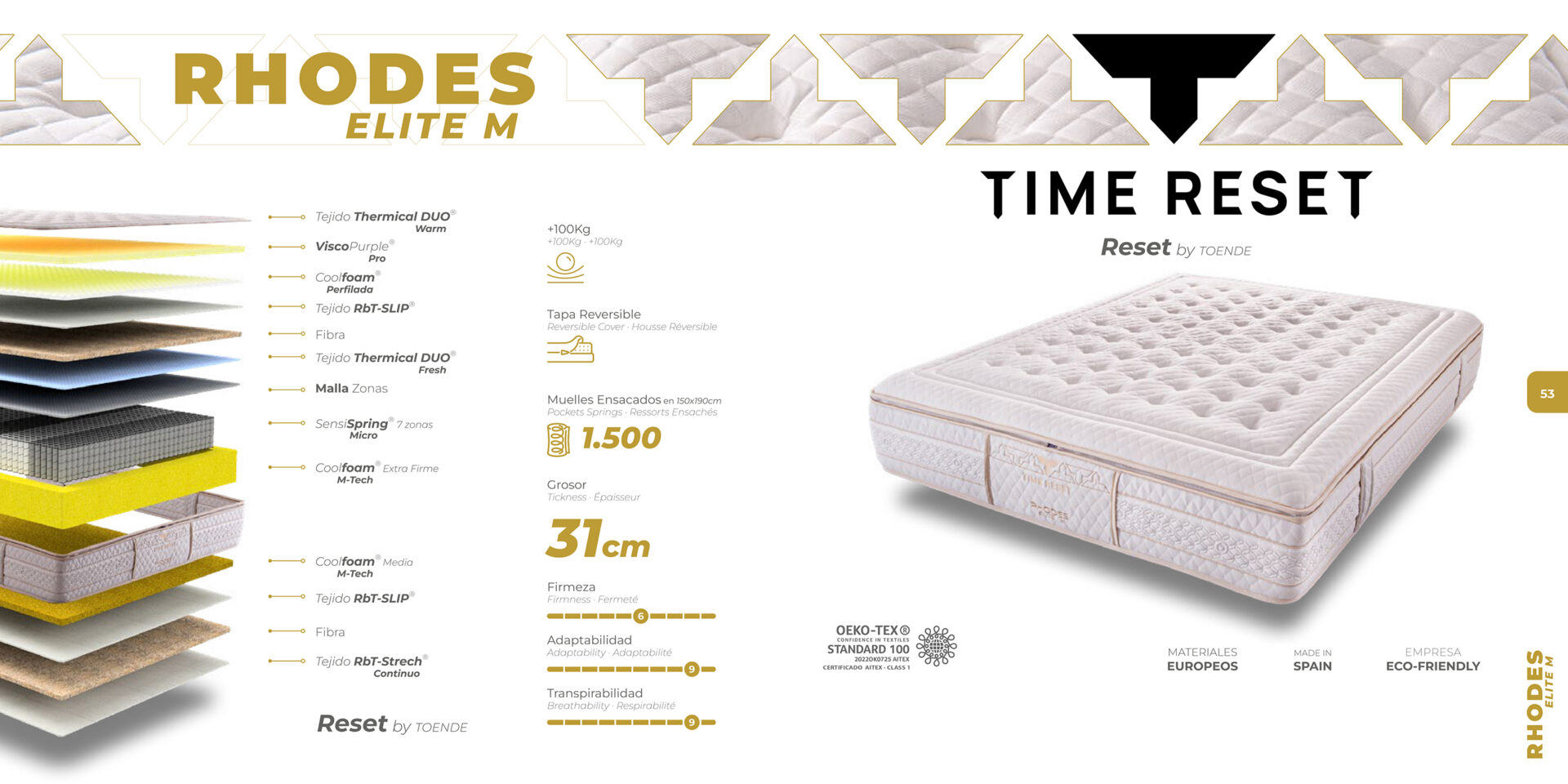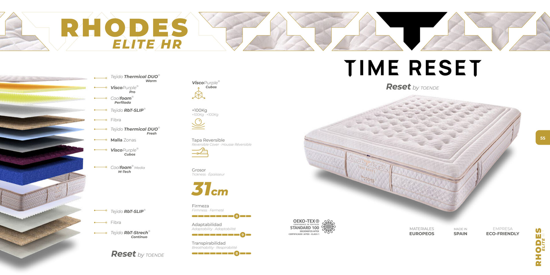 La gama RHODES ELITE de Time Reset by Toende representa una solución de descanso de alto nivel desarrollada con materiales técnicos de última generación, estructuras internas diseñadas para favorecer la ergonomía y un sistema de tapa reversible que optimiza la adaptación térmica durante todo el año.