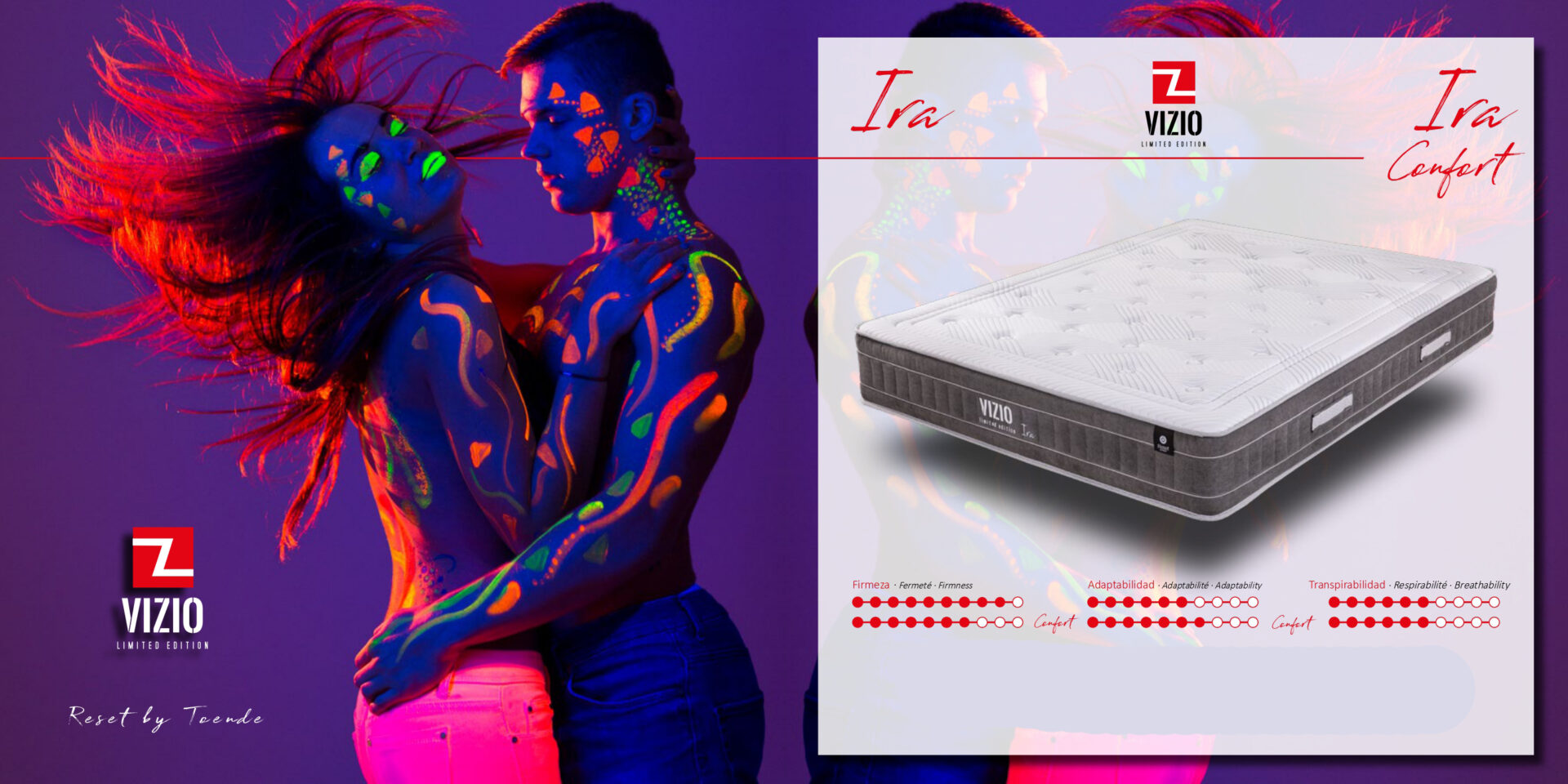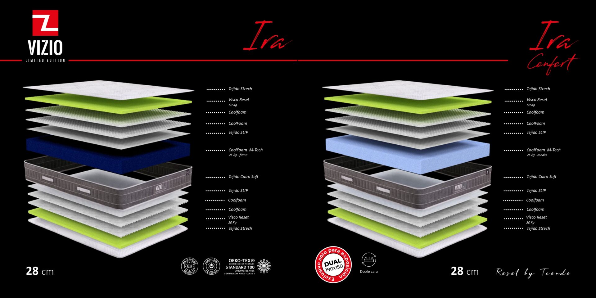 La serie Ira se posiciona como la opción de máxima durabilidad y confort simétrico dentro de la línea VIZIO Limited Edition (Reset by Toende). Su característica distintiva es su construcción en Doble Cara, lo que permite utilizar el colchón por ambos lados con el mismo nivel de acogida y calidad.