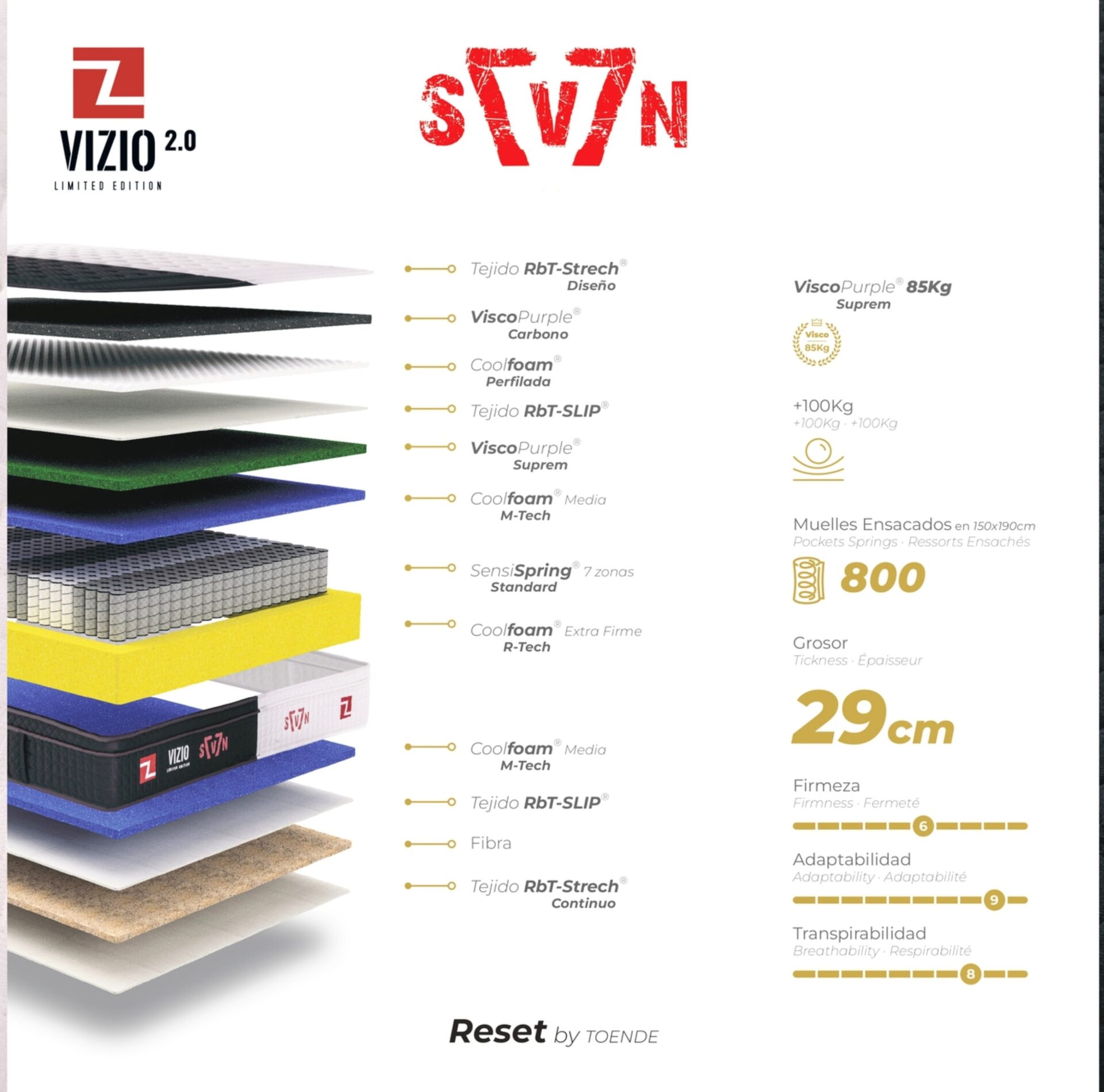 El modelo SEVEN de Reset by TOENDE ha sido desarrollado bajo una premisa clara: lograr la armonía total. Con unas métricas idénticas en todas sus prestaciones, este colchón de 30 cm de altura y diseño de una sola cara (1 Cara) está pensado para quienes no quieren renunciar a nada.
